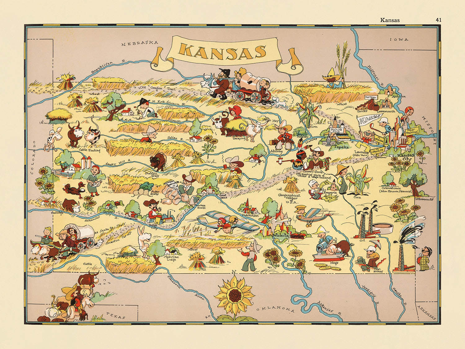 - Name of the map: Kansas (from the pictorial atlas by Ruth Taylor White, 1935)