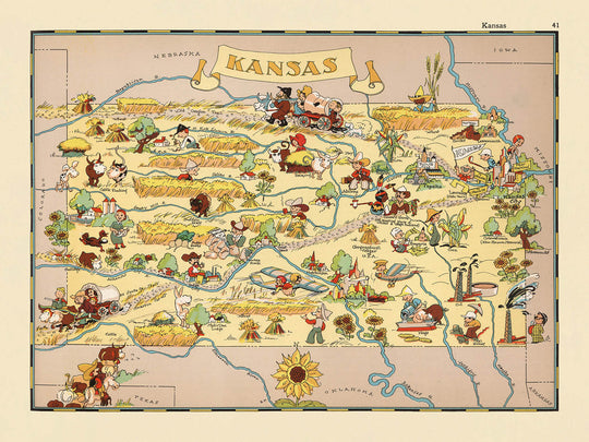 The map’s surface is alive with scenes that evoke the agricultural might of Kansas: golden wheat fields stretch across the plains, punctuated by sturdy farm machinery and bustling harvesters. Cowboys drive cattle across open rangeland, a nod to the state’s storied past as a cattle frontier. Sunflowers bloom with exuberance, while bison roam the prairies, recalling the untamed wilderness that once dominated the region. These vivid illustrations do more than decorate—they encapsulate the economic and cultural lifeblood of Kansas, reflecting both its natural abundance and the industrious spirit of its people.