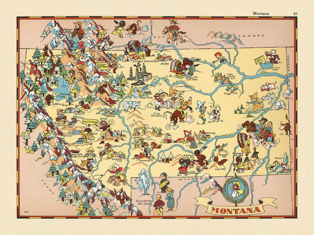 Pictorial Map of Montana by Ruth Taylor White, 1935: Billings, Missoula, Yellowstone & Glacier National Parks, Rocky Mountains, Missouri River