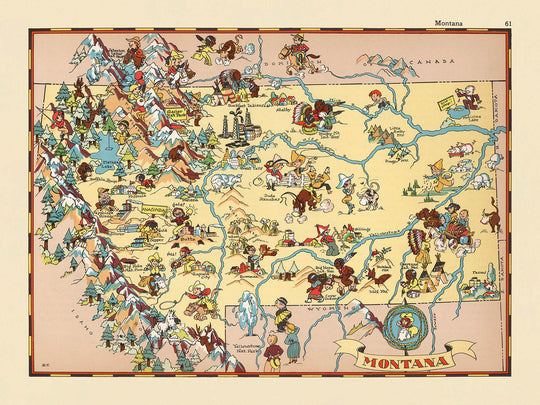 Beyond its geographical accuracy, “Montana” serves as a window into the state’s economic and social life during the early twentieth century. The illustrations teem with references to ranching, mining, agriculture, and timber—industries that shaped Montana’s development and identity. Wildlife such as bears, bison, and deer roam freely across the landscape, while scenes of wheat fields and farmsteads evoke the region’s agricultural abundance. The Great Plains are depicted with sweeping prairie imagery, contrasting beautifully with the forested mountain regions and river valleys.