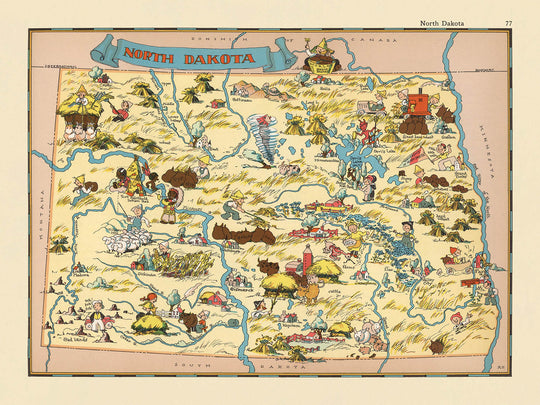 Step into the whimsical world of 1930s Americana with "North Dakota," a captivating pictorial map created by the renowned Ruth Taylor White in 1935. Bearing its original title, this map is a vivid celebration of North Dakota’s spirit, offering an enchanting window into the state’s culture, landscape, and identity during a pivotal era in American history. The map is a masterclass in both artistry and storytelling, inviting viewers to explore a bygone time through its playful yet meticulous illustrations. Each element, from the decorative title cartouche to the carefully delineated county boundaries, is thoughtfully designed to capture the essence of North Dakota as it was perceived nearly a century ago.