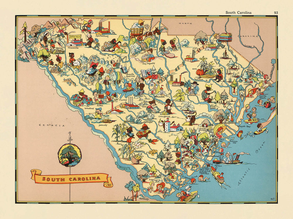 - The map uses vibrant, cartoon-like illustrations to depict stereotypical and cultural elements of South Carolina as seen in the 1930s.