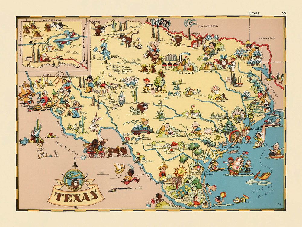 Step into the vibrant world of 1930s Texas with the captivating pictorial map titled simply “Texas,” created by the celebrated cartographer Ruth Taylor White in 1935. This map, a centerpiece from a whimsical atlas series, radiates with color and personality, inviting viewers to explore the Lone Star State through a lens of playful artistry and cultural pride. White’s approach transforms the traditional map into a canvas teeming with life, where every county boundary is outlined and the entire state is brought to life with lively illustrations that reflect the era’s spirit and the unique Texan identity.