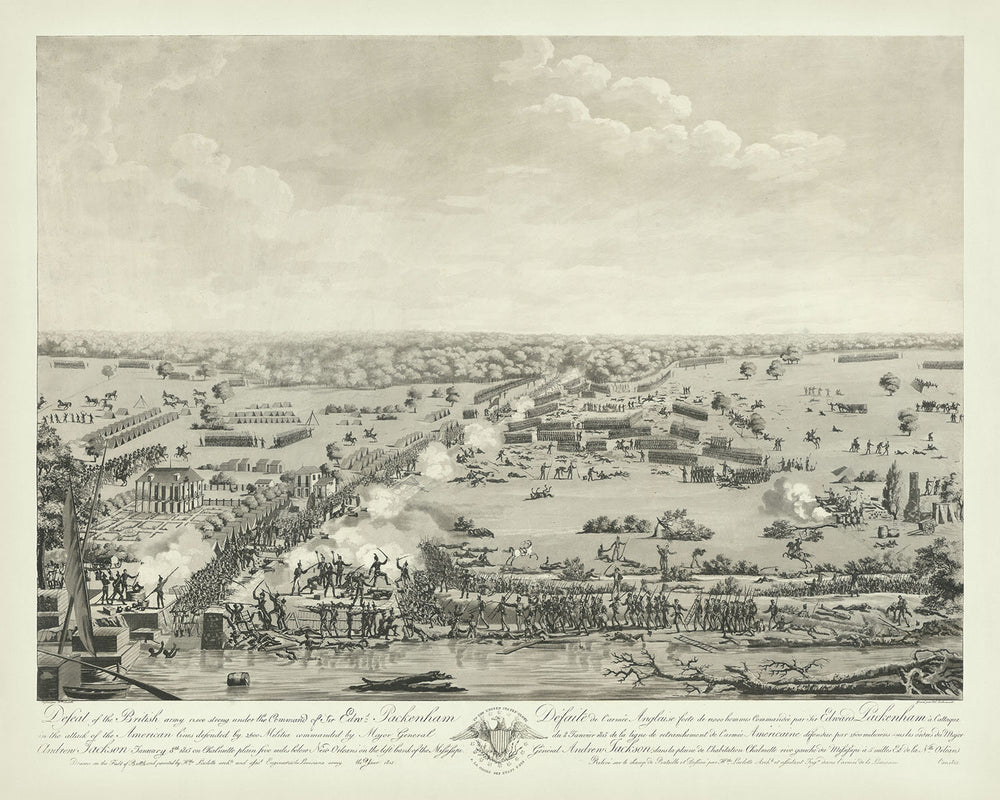 Sumérgete en el momento histórico de la Batalla de Nueva Orleans con esta acuarela meticulosamente detallada de Jean-Hyacinthe Laclotte, publicada por primera vez en 1817. Esta pieza es aclamada como "[L]a más históricamente precisa y mejor ejecutada de todas las impresiones [de la Batalla de Nueva Orleans,] sin importar el medio..." por W.C. Cook. Captura el choque final de la Guerra de 1812, un encuentro decisivo donde las fuerzas estadounidenses, lideradas por el Mayor General Andrew Jackson, repelieron triunfalmente a las tropas británicas.