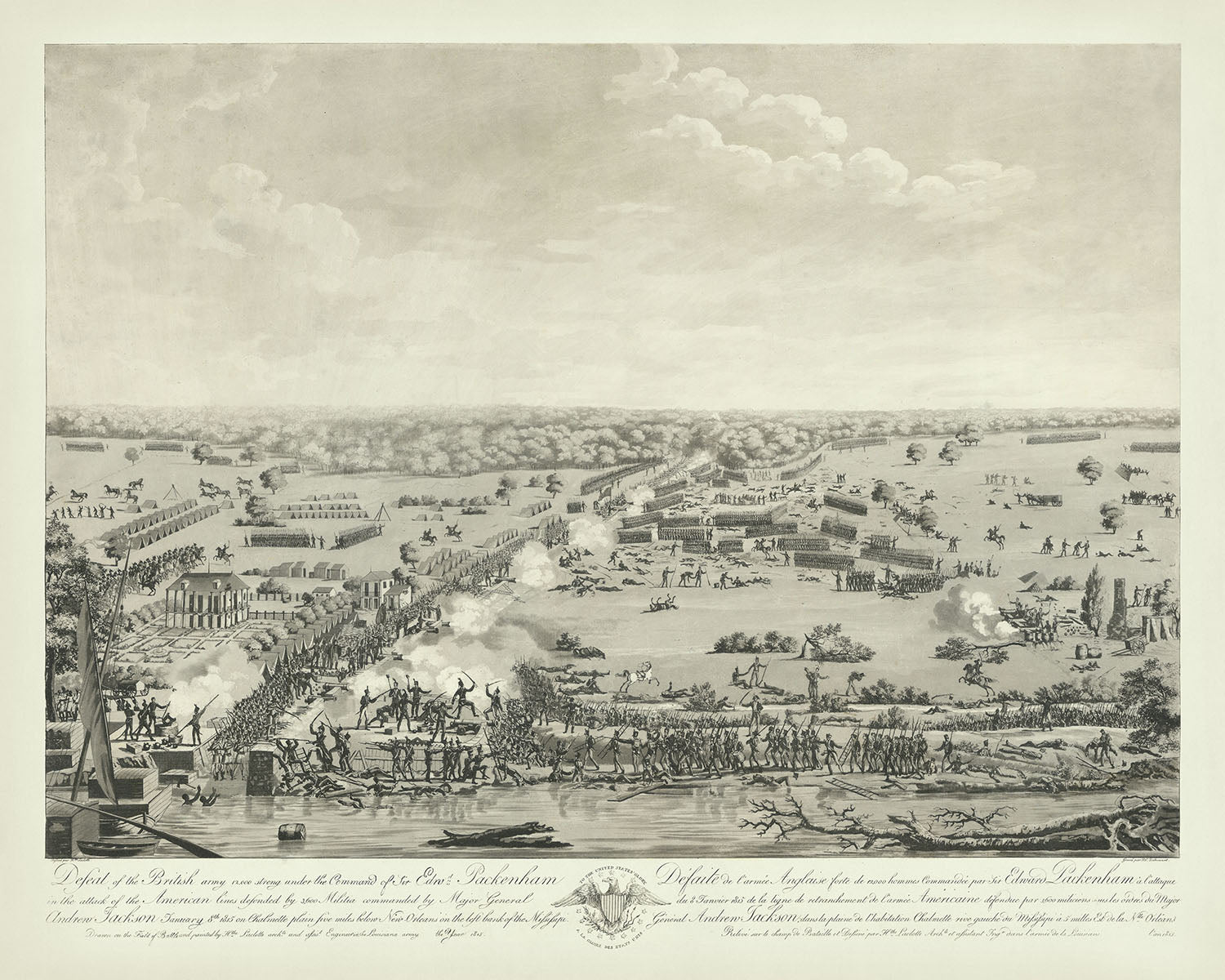 "[L]a representación de Laclotte como confiable y tal autoridad la ha convertido en la vista más copiada de la batalla," señala Cook. La grabación presenta títulos en francés e inglés, elegantemente separados por un águila americana y la inscripción "A la gloria de los Estados Unidos." El ambicioso y expansivo panorama proporciona una vista aérea del enfrentamiento en la orilla este del Mississippi durante su máxima intensidad. La robusta artillería americana, las tropas británicas cargando armadas con escaleras, e incluso un animado duelo de espadas están meticulosamente ilustrados.