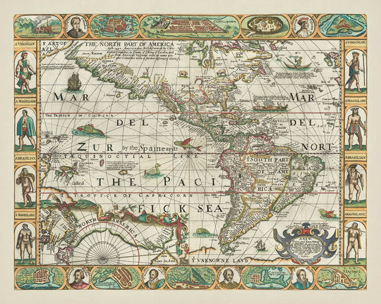 El mapa es un rico tapiz de mitos y realidad, que presenta la legendaria isla de California y el esquivo estrecho de Anian, que se cree que conecta los océanos Atlántico y Pacífico. Estos elementos míticos se entrelazan con los reales, como el Cabo Cod representado con precisión y los primeros asentamientos de Plymouth y Boston. Esta mezcla de hechos y fantasía habla de los desafíos cartográficos y el espíritu imaginativo de la época, lo que lo convierte en una pieza fascinante tanto para historiadores como para coleccionistas.