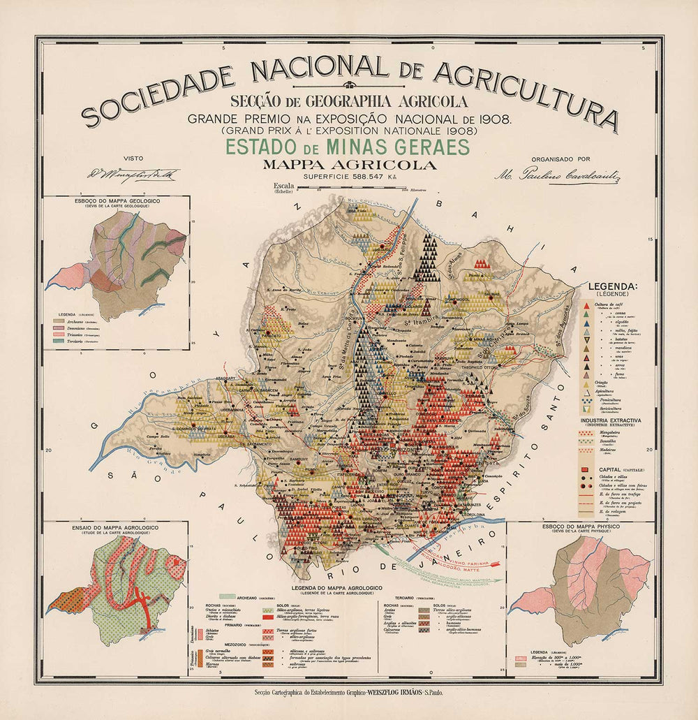 Mapa antiguo de Minas Gerais, Brasil en 1908: Agricultura, Geología, Rocas, Suelo