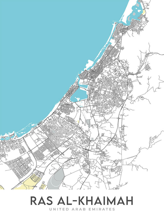 El mapa está meticulosamente elaborado con atención al detalle, asegurando que cada calle, monumento y vecindario esté representado con precisión. El resultado es un mapa visualmente impresionante e informativo que proporciona una visión general completa de la ciudad. Ya seas un residente local, un turista o simplemente alguien que aprecia los hermosos mapas, este mapa de Ras Al Khamiah es un artículo imprescindible para tu colección.