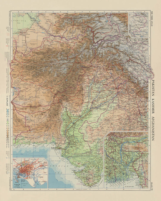 Las ciudades y pueblos ocupan un lugar destacado, destacando Karachi, Lahore y Kabul como importantes centros urbanos. El mapa también destaca otros asentamientos importantes como Peshawar, Quetta y Srinagar, cada uno con su propia importancia histórica y cultural única. Estas áreas urbanas están interconectadas por una red de ferrocarriles y carreteras principales, lo que refleja el desarrollo de infraestructura y la conectividad de la región. La descripción detallada de estos asentamientos humanos proporciona una visión integral de la distribución de la población y los patrones de urbanización de la época.