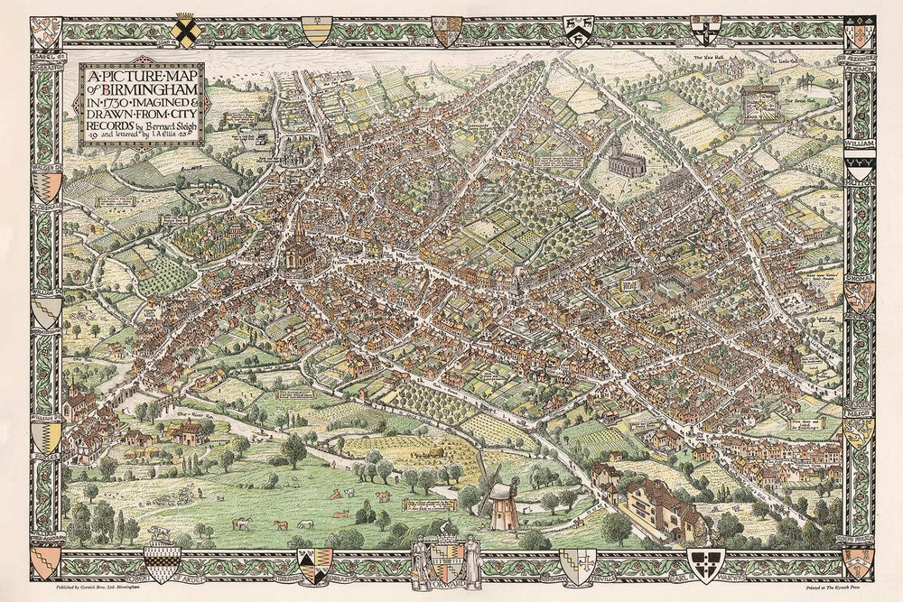 Este inusual y antiguo mapa es el aspecto de Birmingham en 1730, pero en realidad fue creado en 1923 por Bernard Sleigh utilizando registros oficiales.