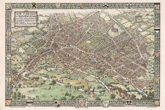 Antiguo mapa pictórico de Birmingham en 1730 por Bernard Sleigh