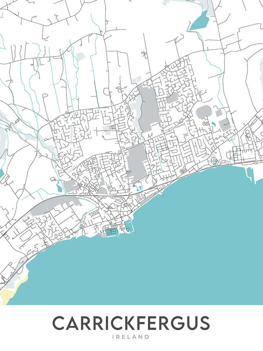 Este mapa de Carrickfergus en Irlanda del Norte es un mapa moderno y detallado de las calles sin etiquetas. El mapa se centra en la ciudad de Carrickfergus y sus áreas circundantes, proporcionando una representación precisa y visualmente atractiva de la región. El mapa cubre una amplia gama de vecindarios, incluyendo Carrickfergus, Eden, Woodburn, Joymount, Kilroot, Mount Merrion, Seapark, Woodlawn y Woodside.