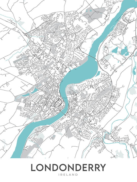 Mapa moderno de la ciudad de Londonderry, Irlanda del Norte: Bogside, Brandywell, Puente Craigavon, Puente Foyle, Guildhall