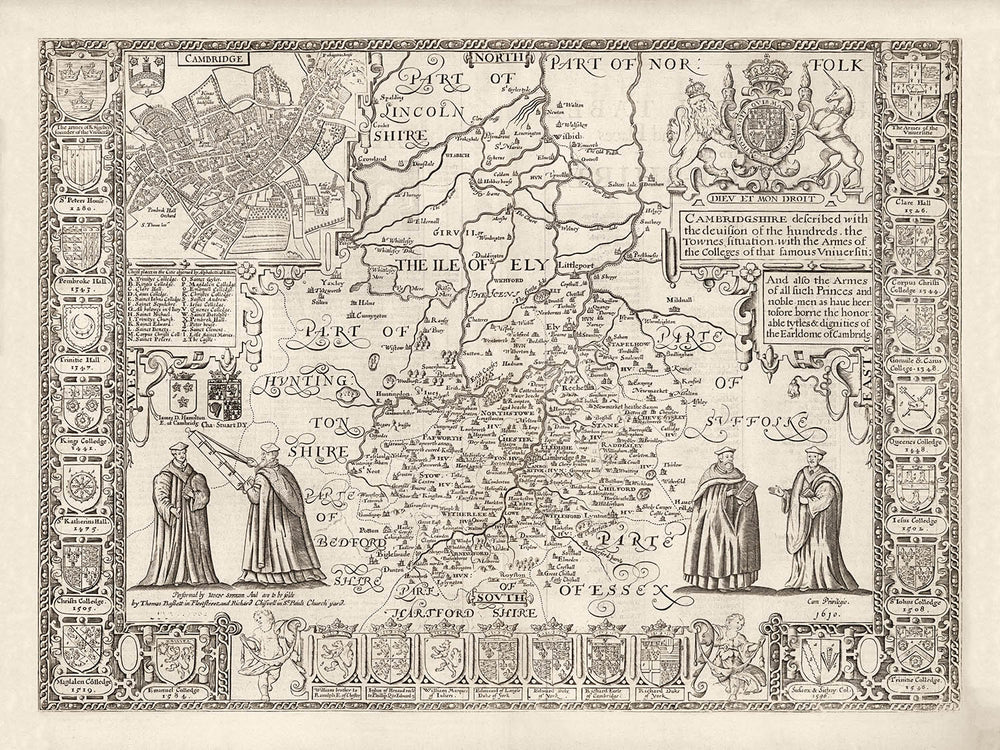 El mapa ampliado de Cambridge muestra algunos de los colegios universitarios que ya existían en 1611, como el Trinity College, Kings College, Corpus Christi, Magdalene, Queens, Clare Hall, Christ's College y Peterhouse (entonces llamado St Peters House). Los escudos de armas de 15 colegios adornan los lados izquierdo y derecho del mapa. Realmente, es todo bastante hermoso.