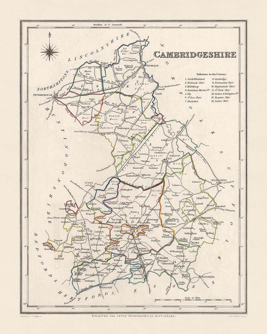 Este antiguo mapa de Cambridgeshire, creado por Samuel Lewis en 1844, es una pieza cautivadora de la historia cartográfica que ofrece una mirada al pasado. Con sus intrincados detalles y su exquisita artesanía, este mapa es imprescindible para cualquier entusiasta de la historia o coleccionista de mapas.