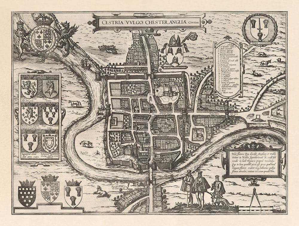 Chester era una ciudad bastante grande hace casi 450 años. Pero las únicas estructuras que probablemente podrás identificar son las murallas romanas, la Catedral de Chester y el Castillo. ¡El río Dee todavía rodea la ciudad también!