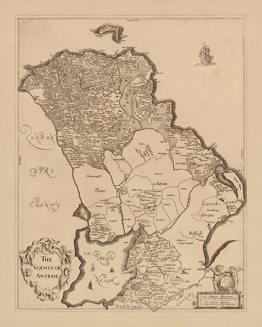 Mapa antiguo del Condado de Antrim por Petty, 1685: Belfast, Carrickfergus, Lisburn, Randalstown