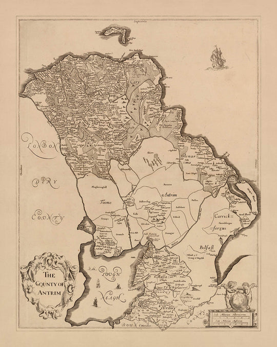 Este mapa del Condado de Antrim, publicado originalmente en 1685 por Sir William Petty, proporciona una visión detallada y fascinante de la historia y la geografía de esta región de Irlanda. El mapa de Petty se basa en el Down Survey de Irlanda, la primera encuesta de tierras detallada a escala nacional en cualquier parte del mundo. La encuesta se llevó a cabo de 1656 a 1658 para medir tierras que iban a ser tomadas de los propietarios católicos irlandeses y entregadas a los protestantes ingleses.