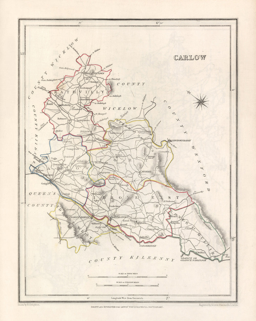 Mapa antiguo del condado de Carlow por Samuel Lewis, 1844: Tullow, Hacketstown, Leighlinbridge, Rathvilly, Myshall