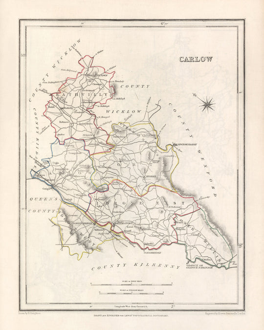 Sumérgete en la rica historia y la cautivadora belleza del condado de Carlow con el mapa antiguo de Carlow de Samuel Lewis, 1844. Este extraordinario mapa te permite rastrear las huellas del pasado, explorando los asentamientos, los monumentos y las maravillas naturales que han dado forma a este región notable.