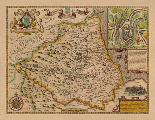 En la parte superior derecha hay un grabado detallado de la ciudad de Durham. Sunderland también es visible en este mapa, antes de convertirse en parte de Tyne y Wear.
