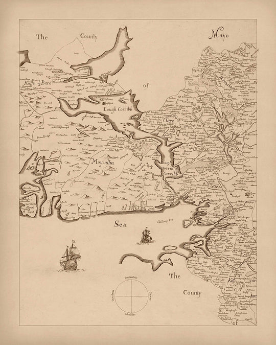 Este mapa del Condado de Galway, publicado originalmente en 1685 por Sir William Petty, es un mapa político y físico detallado que proporciona una gran cantidad de información sobre la región. El mapa se basa en el Down Survey de Irlanda, la primera encuesta de tierras detallada a escala nacional en cualquier parte del mundo, que se llevó a cabo de 1656 a 1658. El mapa de Petty es una versión a escala reducida del Down Survey original, pero aún así logra incluir una impresionante cantidad de detalles.