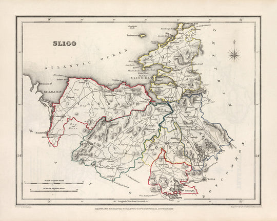 Sea dueño de un pedazo de historia con el Mapa antiguo de Sligo de Samuel Lewis, 1844, y embárquese en un viaje en el tiempo para descubrir los cautivadores pueblos, ciudades y maravillas naturales que han dado forma al rico patrimonio del condado de Sligo.
