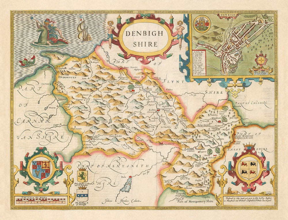 En la parte superior derecha hay un grabado detallado de Denbigh, la ciudad del condado. Notablemente, Rhyl no está en este mapa - en ese entonces estaba en Flintshire.