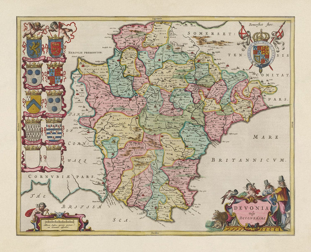 Viejo mapa de Devon en 1665 por Joan Blaeu: Plymouth, Exeter, Torquay, Paignton, Exmouth, Barnstaple, País Oeste