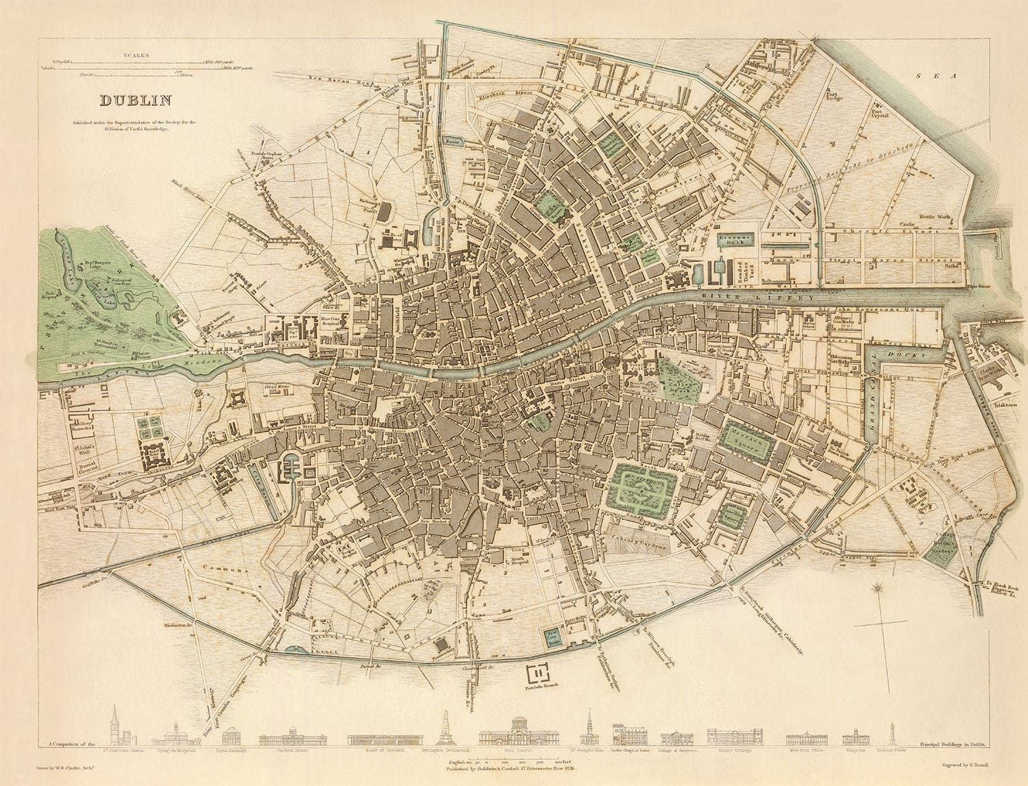 A lo largo de la parte inferior del mapa hay bocetos laterales de algunos de los principales monumentos de Dublín, incluyendo Four Courts, el Banco de Irlanda y el Testimonio de Wellington.