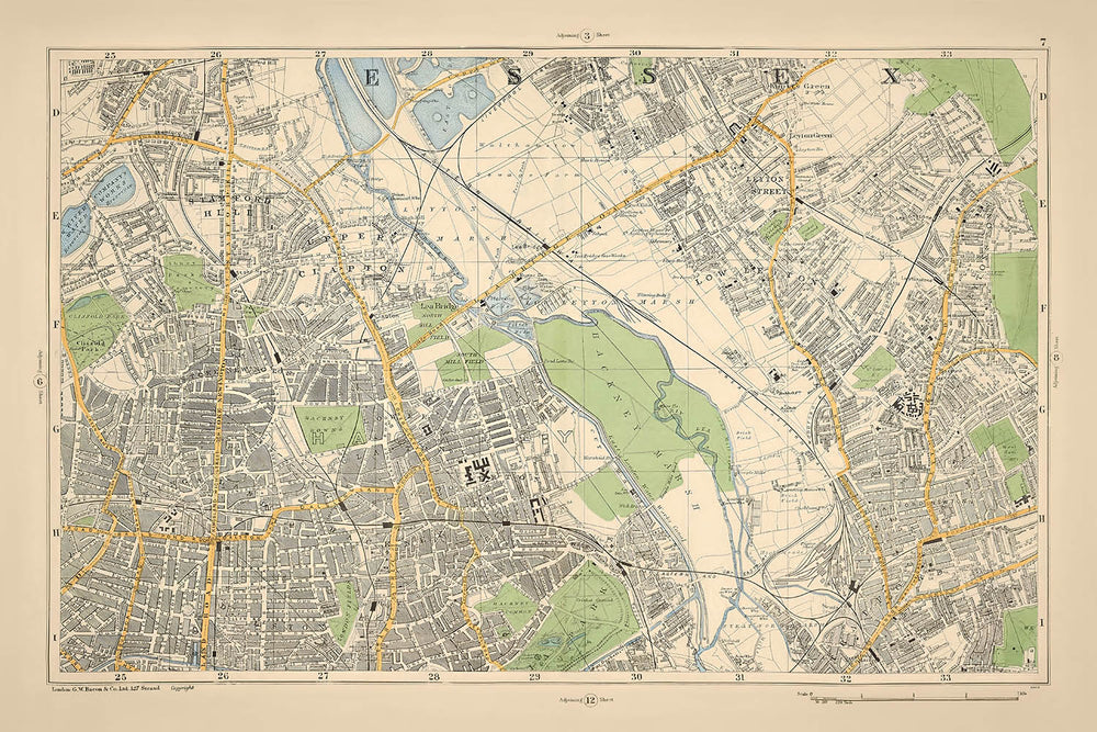 El mapa es un testimonio de la dinámica evolución de Londres, mostrando hitos significativos como el Lea Bridge y los extensos Hackney Downs. Estas áreas, ahora densamente pobladas, alguna vez estaban salpicadas de espacios abiertos e infraestructura en crecimiento. El mapa ilustra bellamente la yuxtaposición de los hitos victorianos y las vastas extensiones de tierras agrícolas que esperaban desarrollo, ofreciendo una visión única del pasado de la ciudad y su camino hacia la modernización.
