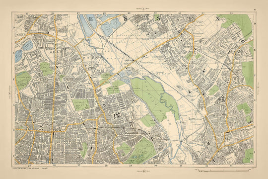 Adéntrate en la vibrante historia de Londres con "Hoja 7 del Nuevo Atlas de Gran Escala de Londres y sus Suburbios," elaborado en 1900 por la estimada Bacon & Co. Este mapa captura el Londres Este-Central en el amanecer del siglo XX, un período marcado por una rápida expansión urbana y la consolidación de la grandeza arquitectónica victoriana. A medida que exploras esta exquisita pieza, recorrerás vecindarios como Stamford Hill y Upper Clapton, áreas que comenzaban a transformarse de paisajes pastorales en bulliciosas comunidades urbanas.