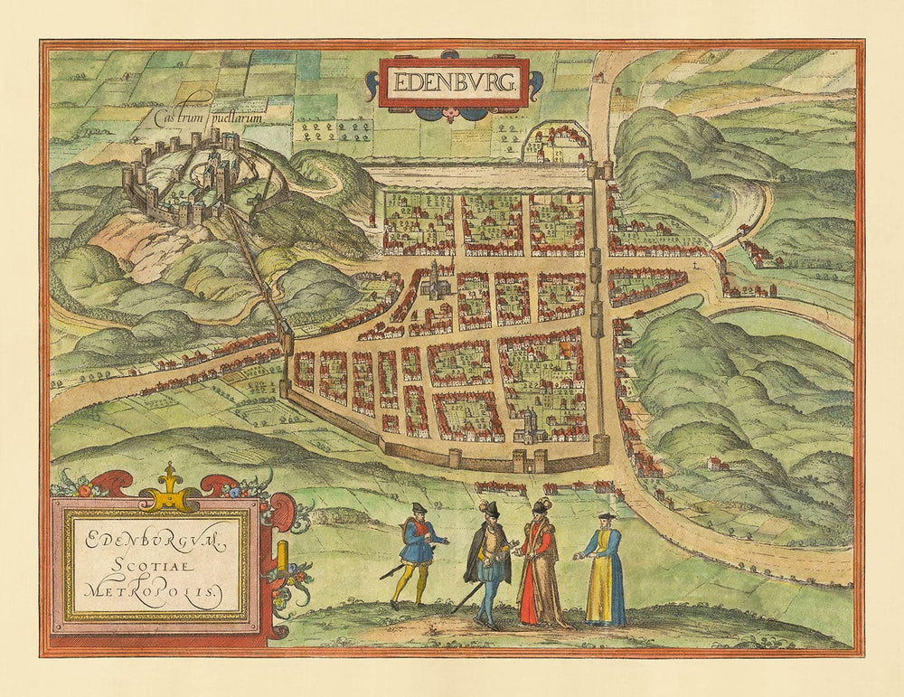 Mapa antiguo de Edimburgo, 1580 por Georg Braun: Castillo, Murallas de la ciudad, Catedral de San Giles, Ciudad Vieja