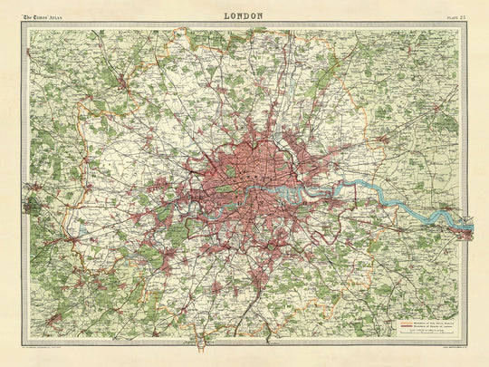 Publicado en un momento en que la población de Londres se duplicaba y se expandía rápidamente, este mapa captura la esencia de una era de profundos cambios y desarrollo. Refleja la transformación de una metrópolis densamente poblada a un área urbana en expansión, absorbiendo pueblos y ciudades circundantes. Este mapa no es simplemente una ayuda para la navegación, sino un documento histórico que captura el espíritu del Londres de principios del siglo XX.