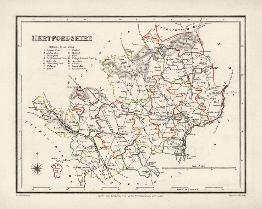 Mapa antiguo de Hertfordshire por Samuel Lewis, 1844: St Albans, Watford, Hemel Hempstead, Stevenage, Hitchin