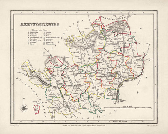 Sea dueño de un pedazo de historia con el mapa antiguo de Hertfordshire de Samuel Lewis en 1844 y sumérjase en el rico patrimonio y los cautivadores paisajes de este extraordinario condado.