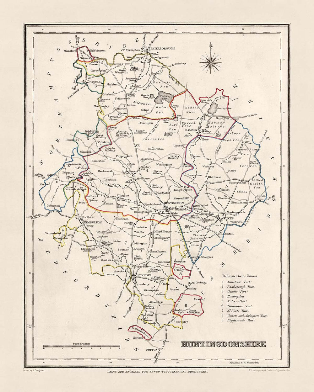 Mapa antiguo de Huntingdonshire por Samuel Lewis, 1844: St. Ives, St. Neots, Ramsey, Godmanchester y Kimbolton