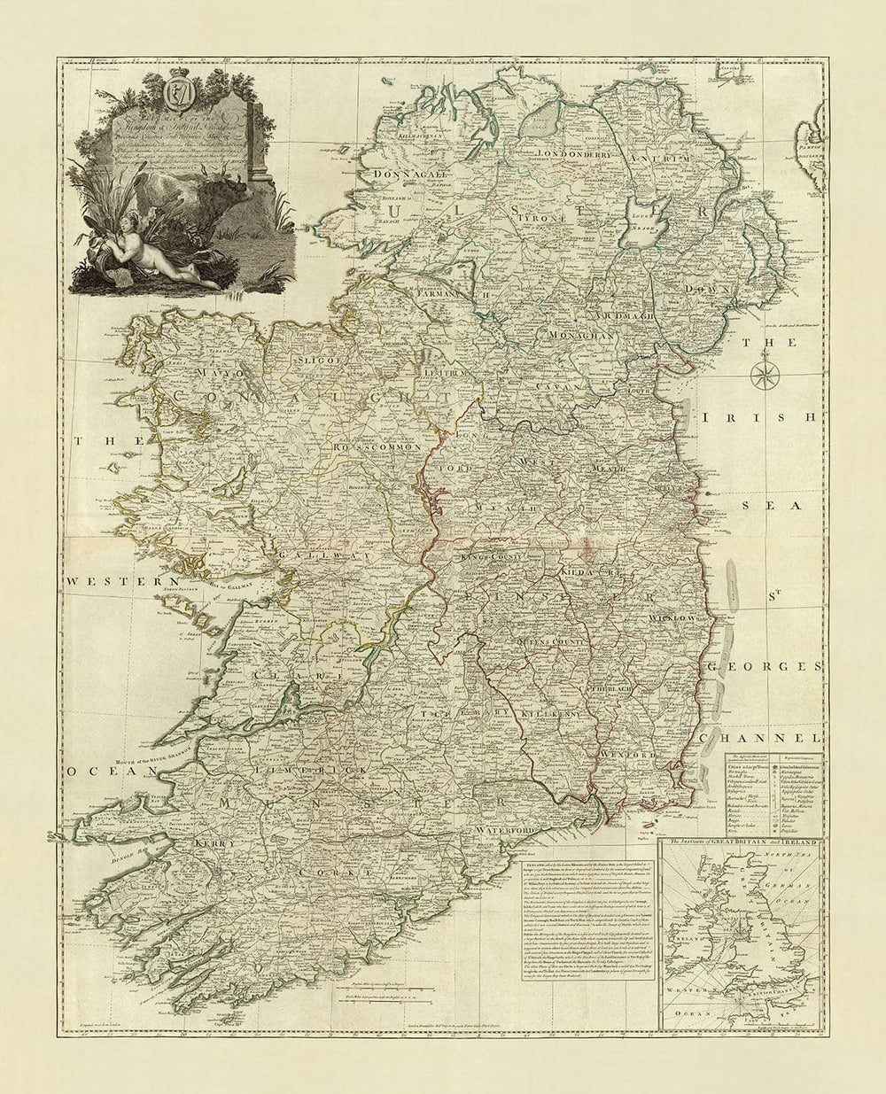 Este es uno de los mapas antiguos más finos y raros de Irlanda, que muestra todos los condados y provincias originales. El mapa originalmente consistía en 4 hojas, pero aquí se presenta como un solo mapa con un nivel de detalle increíble.