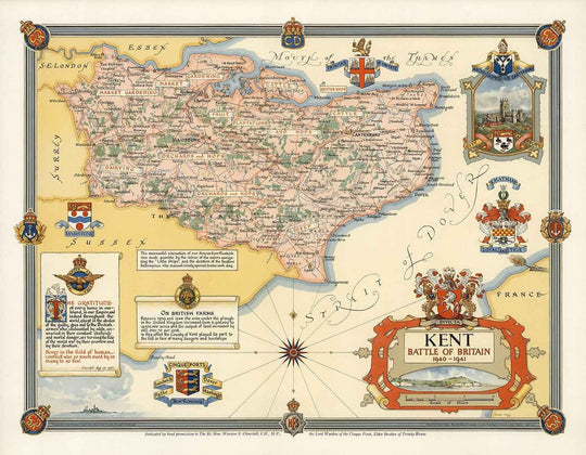 Además de un mapa detallado del condado en el medio, Clegg ha adornado este mapa con una serie de ilustraciones muy detalladas y atractivas relacionadas con Kent. Estas incluyen una vista detallada de Canterbury, los acantilados blancos de Kent y la "Batalla de Gran Bretaña", y lo que parece ser un destructor en el mar. También hay algunos otros elementos de la Segunda Guerra Mundial y una cita de Winston Churchill: "nunca en el campo del conflicto humano se debió tanto a tan pocos por tantos".