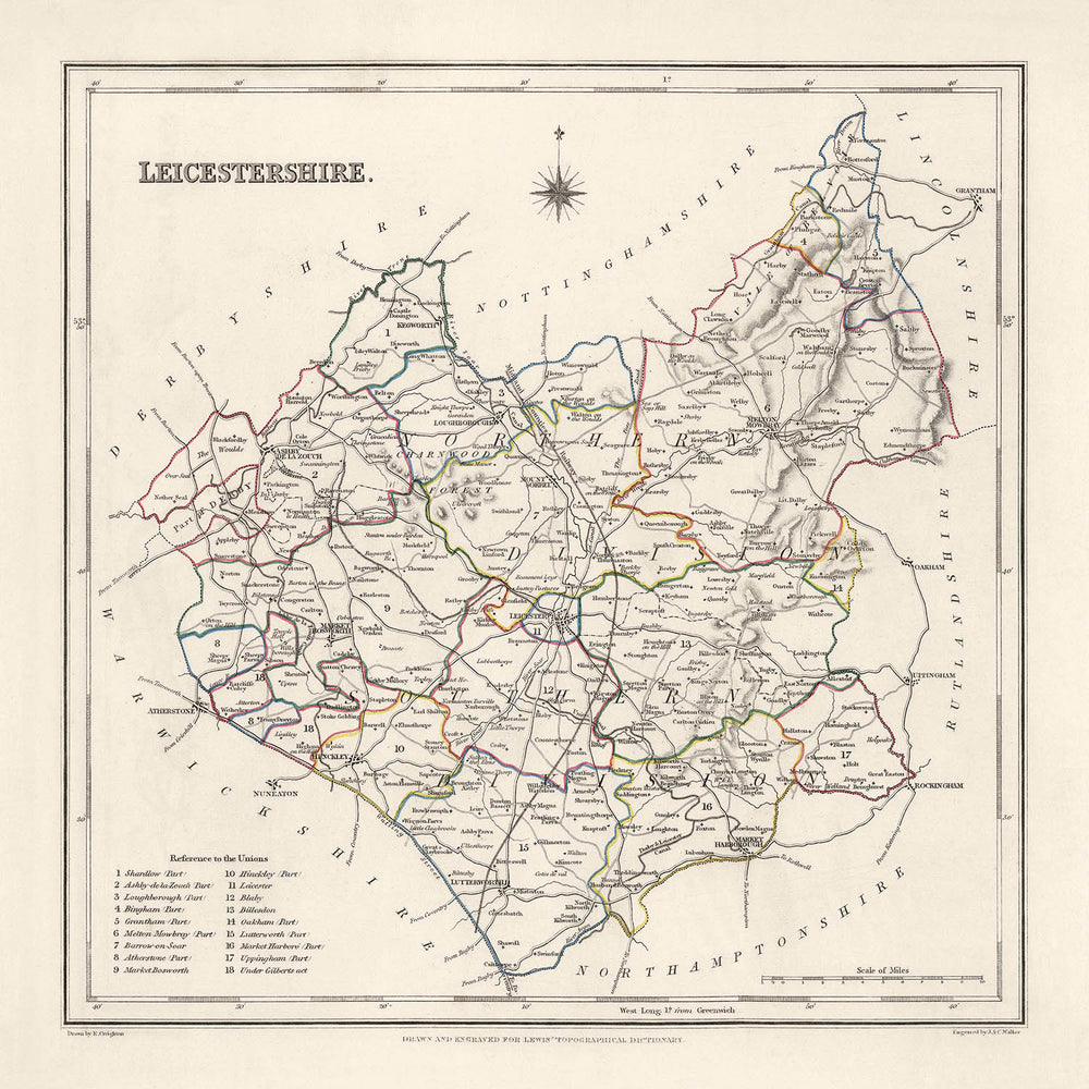 Mapa antiguo de Leicestershire por Samuel Lewis, 1844: Leicester, Melton Mowbray, Loughborough, Hinckley, Ashby-de-la-Zouch