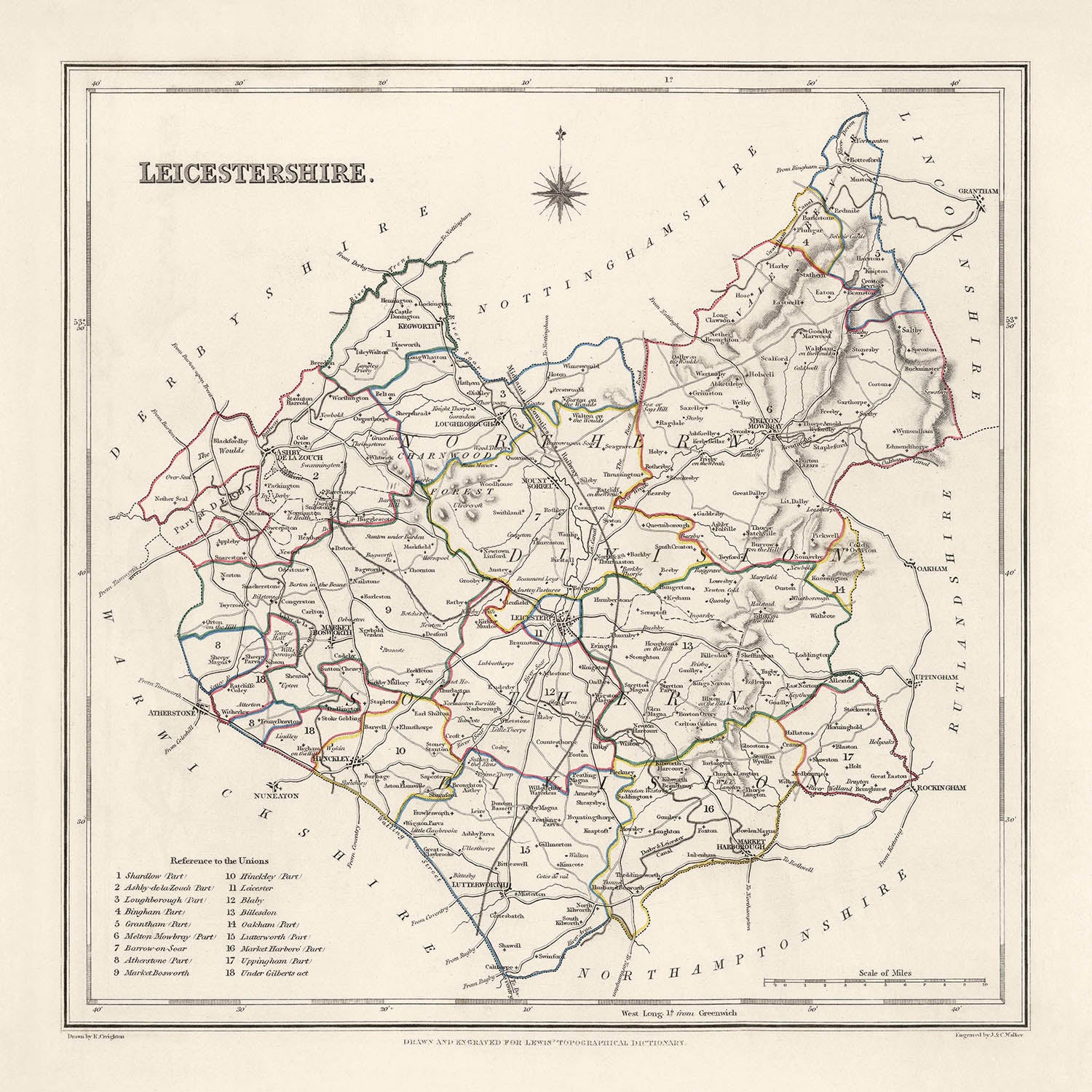 Este antiguo mapa de Leicestershire realizado por Samuel Lewis en 1844 muestra los límites históricos del condado y ofrece una visión fascinante del pasado. Con sus intrincados detalles y su exquisita artesanía cartográfica, este mapa ofrece una oportunidad única de explorar la región tal como era hace más de 175 años.