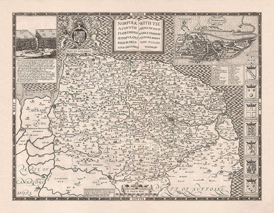En la esquina superior derecha del mapa hay un grabado detallado de Norwich, que entonces (y aún) era la capital de este antiguo condado. Incluso en el siglo XVII, Norwich estaba bastante desarrollada; ¡podrías reconocer algunas de las calles del centro de Noruega hoy en día!