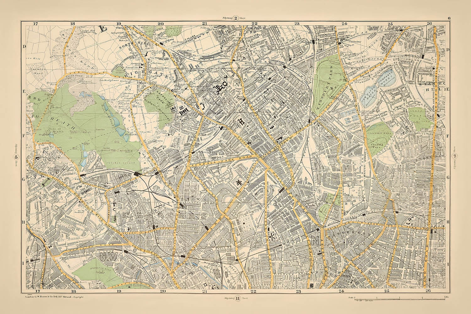 Antigua mapa del centro-norte de Londres, 1900: Hampstead Heath, Camden, Highgate, Finsbury Park, Stoke Newington