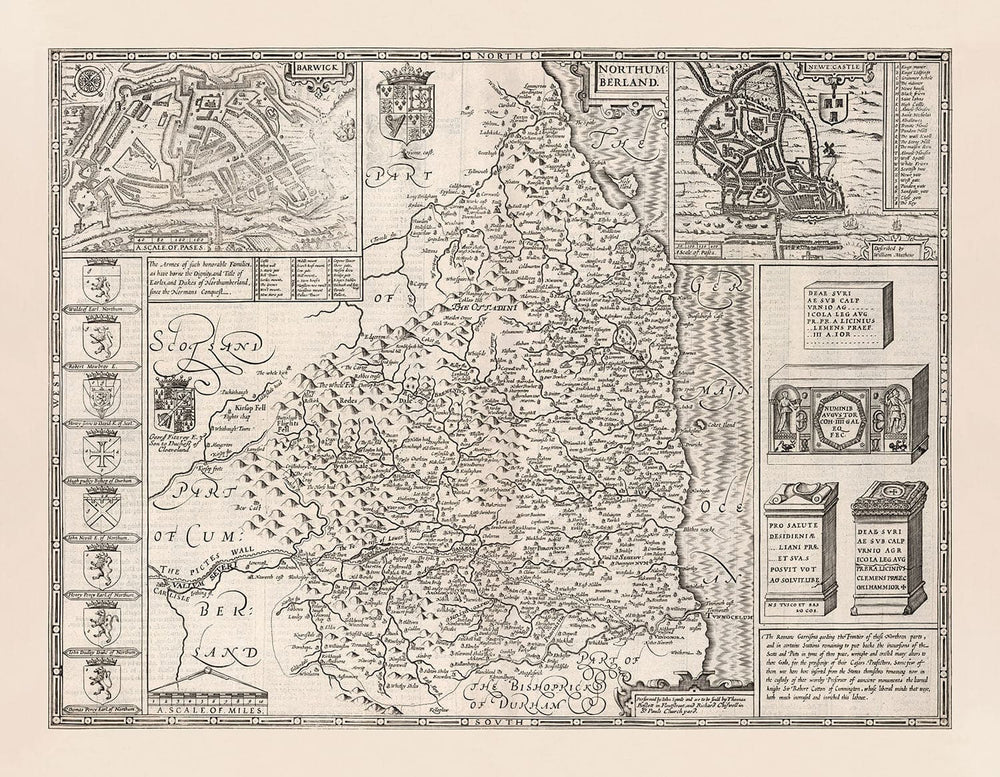 Mapa antiguo de Northumberland en 1611: Newcastle, Gateshead, la pared de Hadrian, South Shields, Tyne y Wear