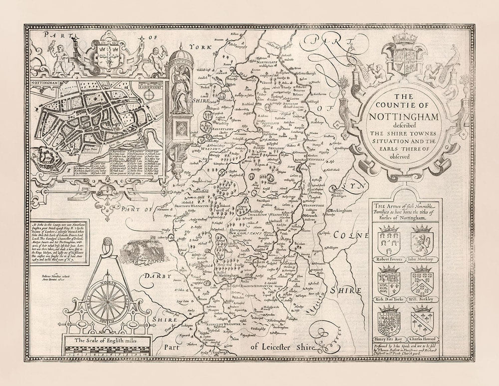 Viejo mapa de Nottinghamshire, 1611 de John Speed - Nottingham, Mansfield, Newark, Workop, Forest Sherwood