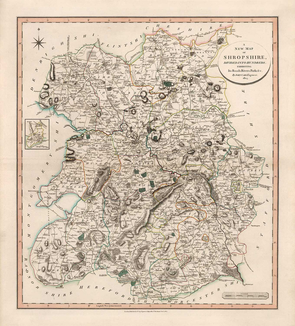 Esta maravillosa antigua mapa de Shropshire fue publicada originalmente en 1805. Fue creada por John Cary.