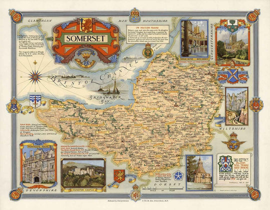 Antiguo mapa de Somerset por Ernest Clegg, 1946: Bath, Wells, Landmarks, World War 2, West Country, Winston Churchill