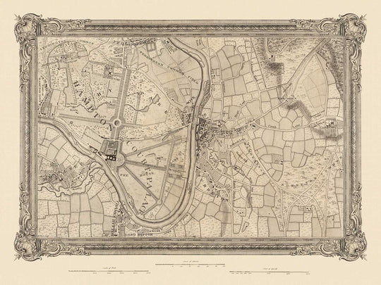 La mayor parte del lado izquierdo del mapa está cubierta por el Palacio de Hampton Court, que fue hogar de Enrique VIII y sus esposas. El palacio está rodeado de hermosos jardines, las Vides de Hampton Court y los laberintos de setos más antiguos que sobreviven. El palacio se abrió al público casi 100 años después, en 1838, por la Reina Victoria y desde entonces ha continuado siendo un imán para los turistas.