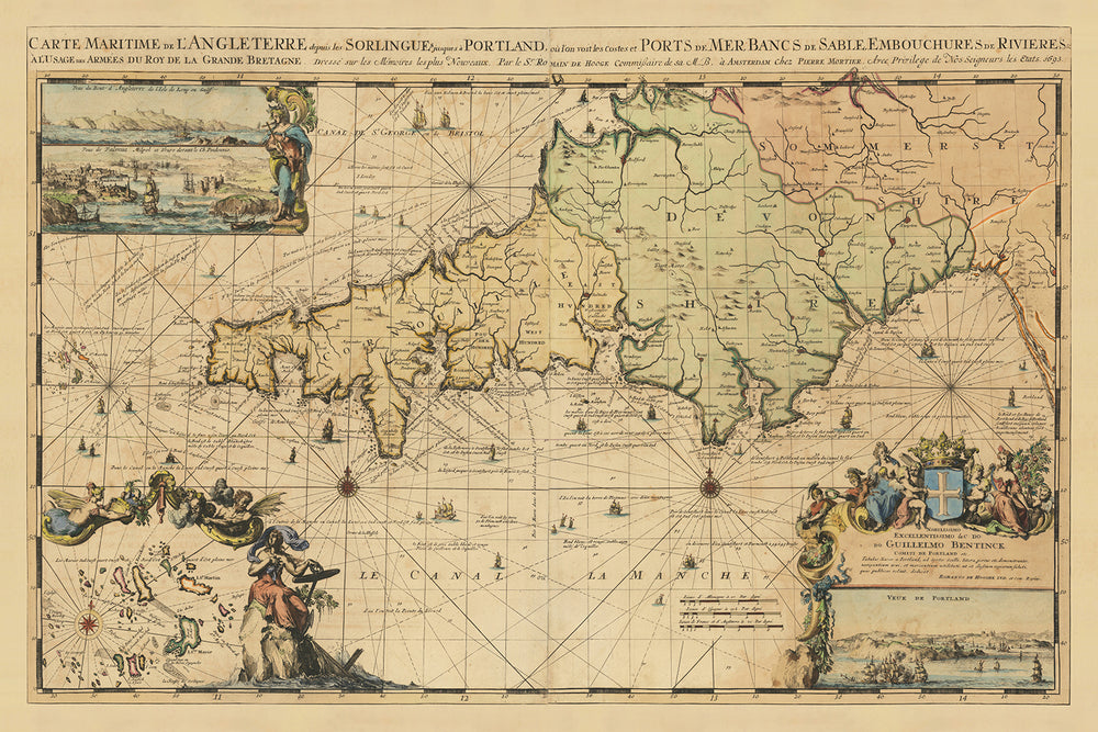 Mapa antiguo del suroeste de Inglaterra por Romeyn De Hooghe, 1693: Cornualles, Devon y West Somerset