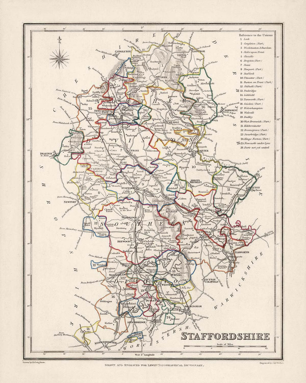 Mapa antiguo de Staffordshire por Samuel Lewis, 1844: Wolverhampton, Stoke-on-Trent, Lichfield, Tamworth, Cannock Chase